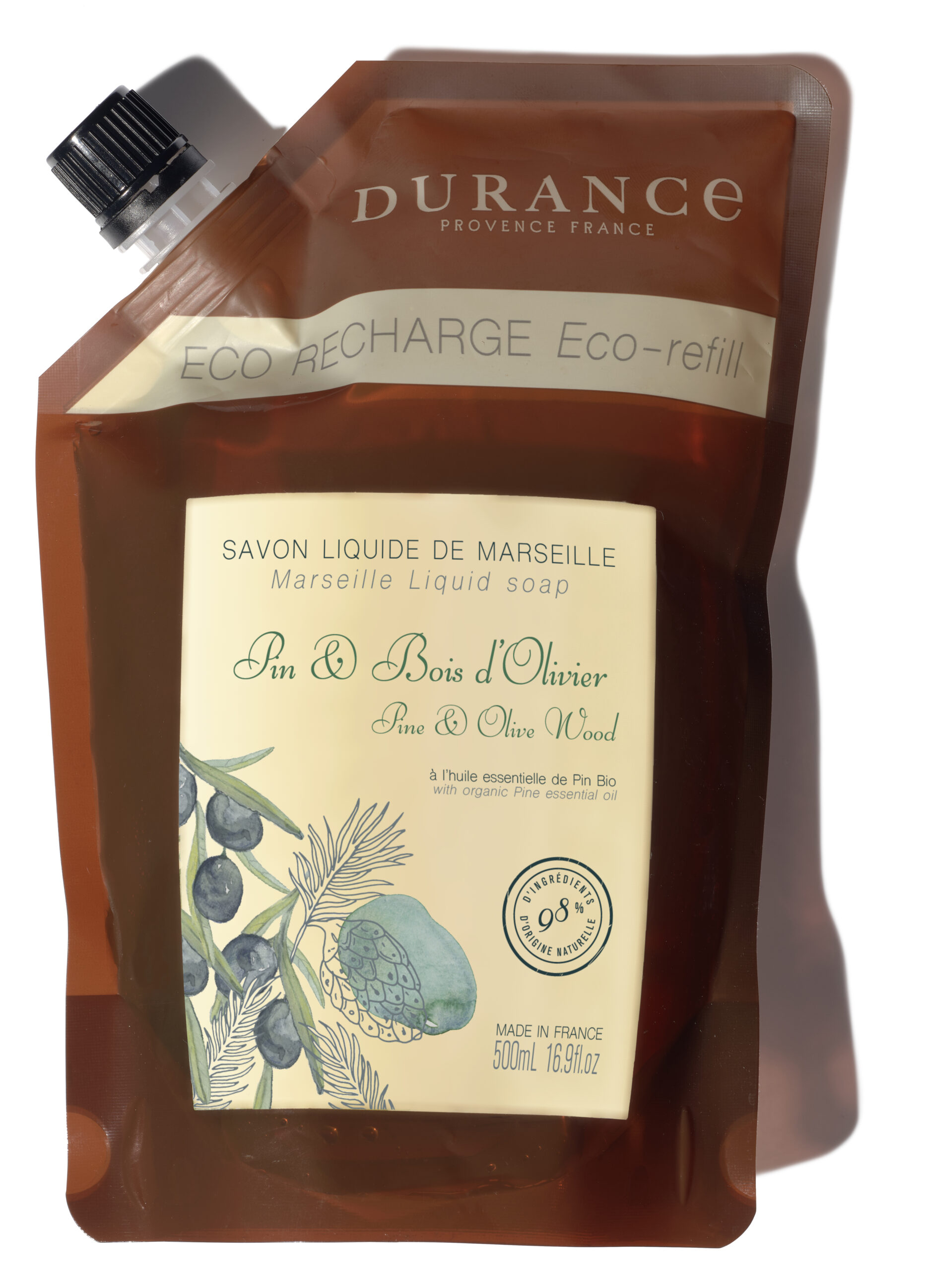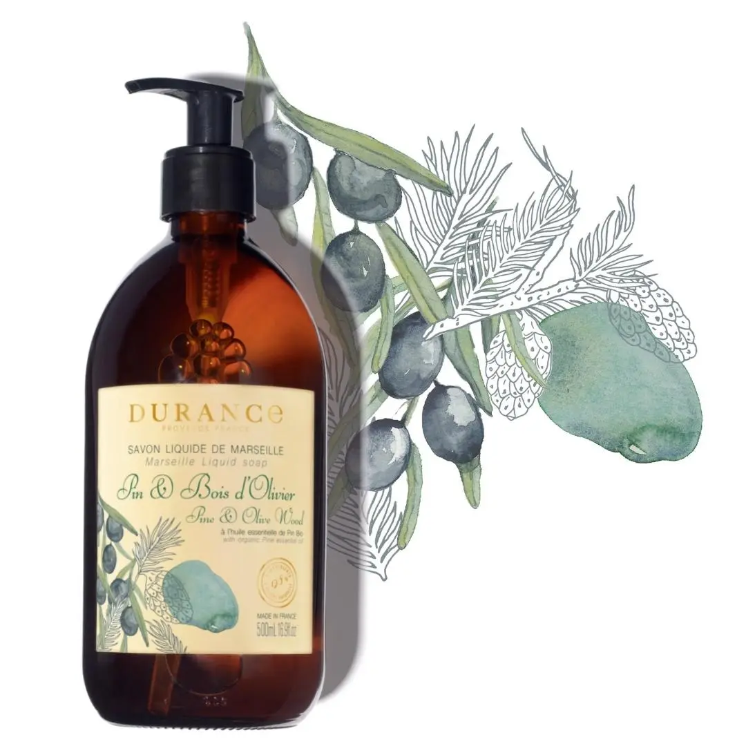 El jabón líquido de pino de Marsella y madera de olivo para cuerpo y manos, elaborado en Provenza, limpia suavemente la piel. Compuesto con un 98 % de ingredientes naturales, su fórmula se basa en jabón de Marsella concentrado, preparado con aceite de oliva orgánico de Provenza en un caldero según la receta tradicional, y también contiene extracto de arroz rojo de Camarga y glicerina.